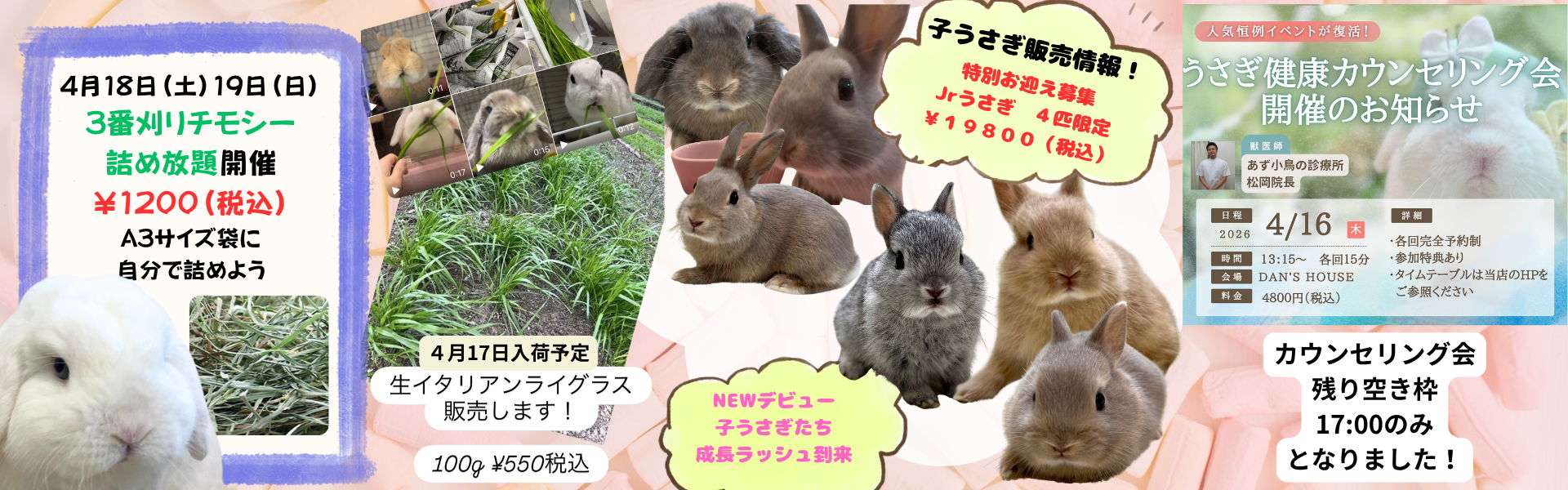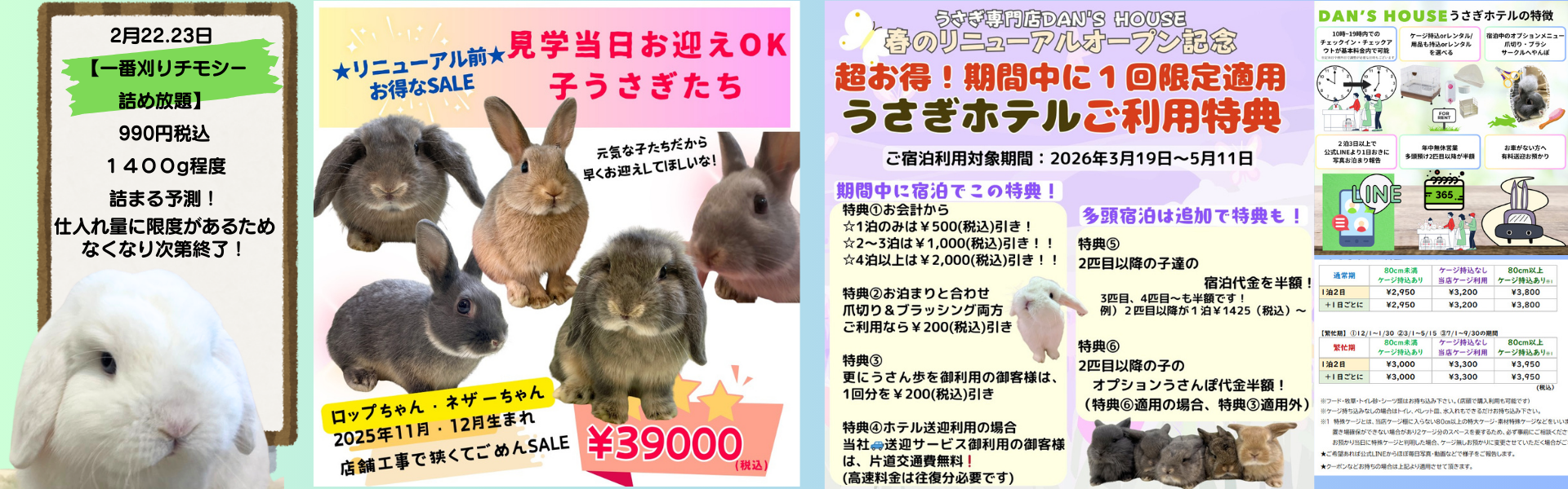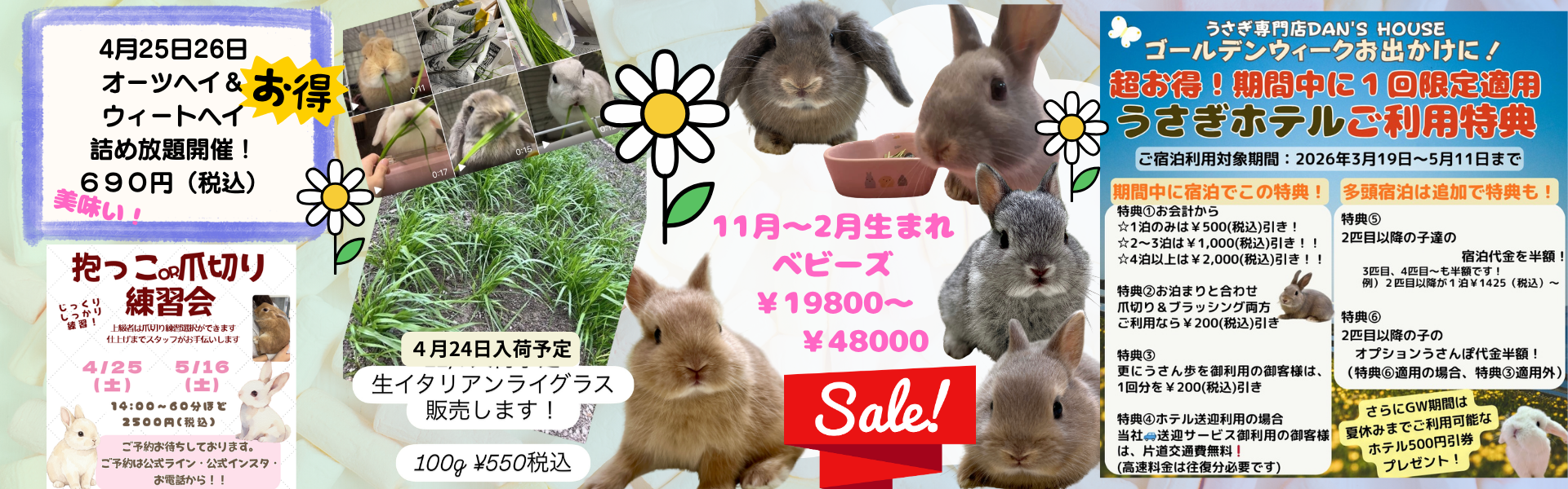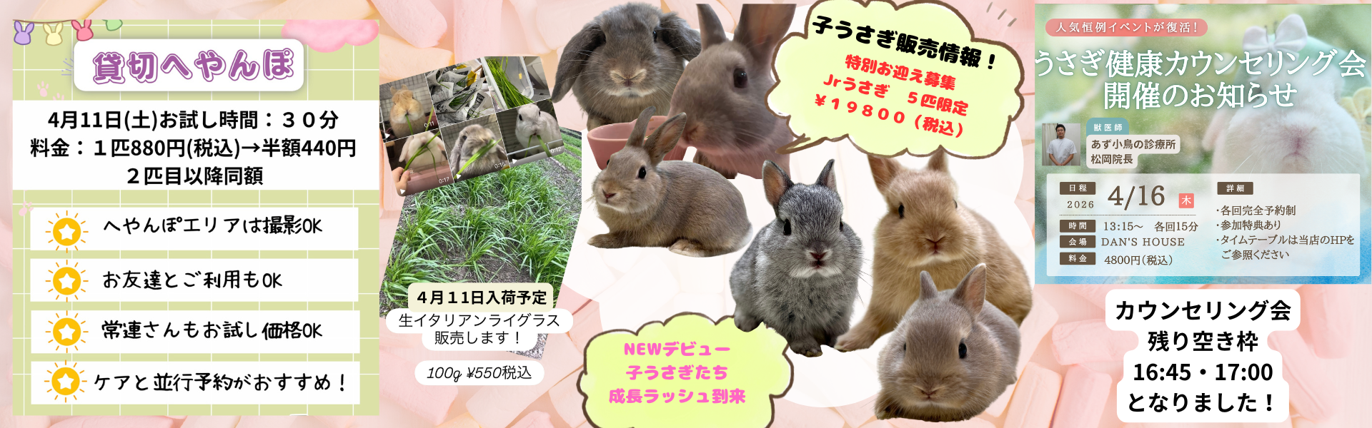 タイミングにより多種多様に子うさぎ達がいるとは限りませんが、たっぷり愛情を注いで育ててきた子達とご来店をお待ちしております。
